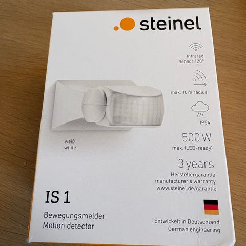 Fronten består av et kvadratisk betjeningspanel med display, montert i en hvit ramme. Tilkoblingsklemmer på baksiden er merket for enkel installasjon av strømtilførsel, last og sensor. Enheten leveres i original eske med bruksanvisning og tilbehør som følger med fra produsent.