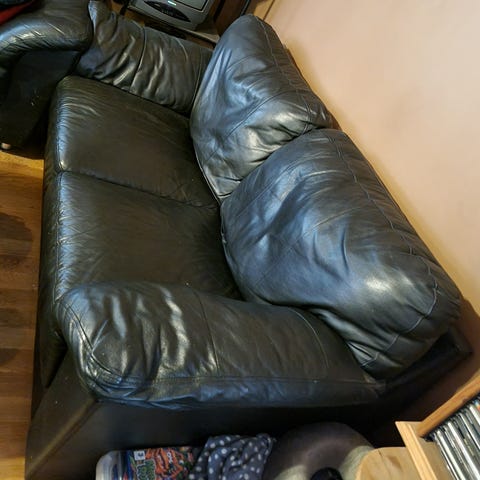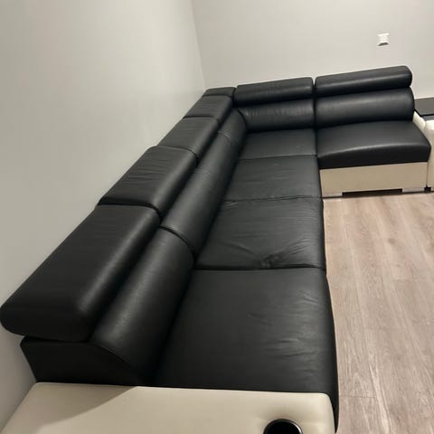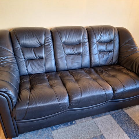 Svart skinnsofa uten riper/ skader. Vanlig bruksslitasje. Må hentes Strømmen