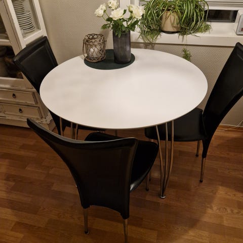 3 Hjellegjerde skinnstoler i svart selges sammen med tilhørende bord. De er pent brukt med noen få bruksmerker på bordet . Selges grunnet flytting/ plassmangel.