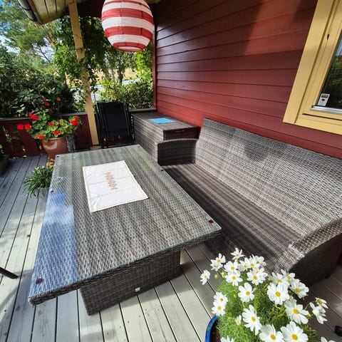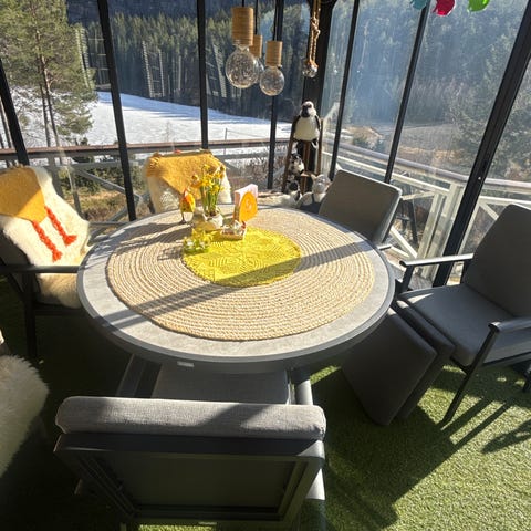 Hagegruppe i aluminium med lyse puter i vannavstøtende olefin. Består av 3-seters sofa, to stoler og rektangulært bord.