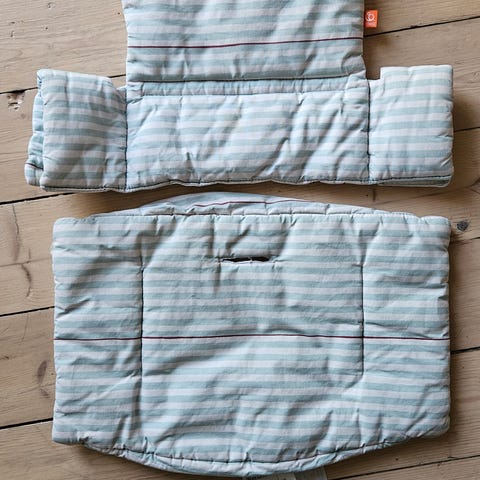 Trekk / pute til Tripp trapp-stol. Består av to polstrede deler som gir ekstra komfort i barnestolen. Hvitt med stjerner i blått og turkis.