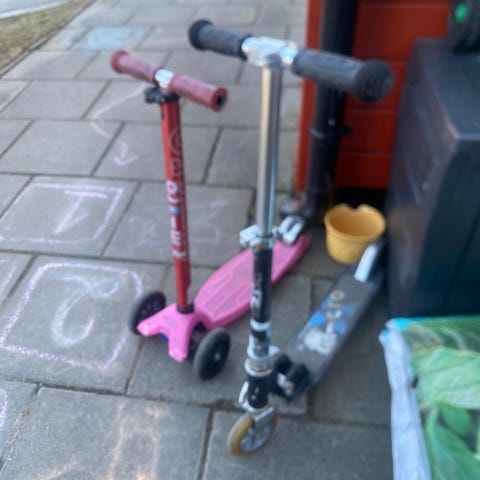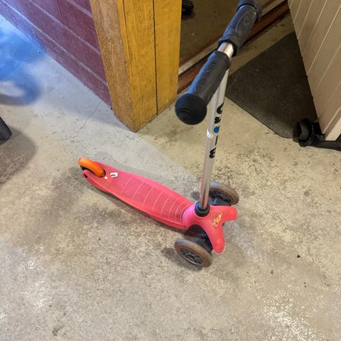 Rosa sparkesykkel med tre hjul. Følger med sete slik at man også kan sitte på den. Pent brukt av et barn.