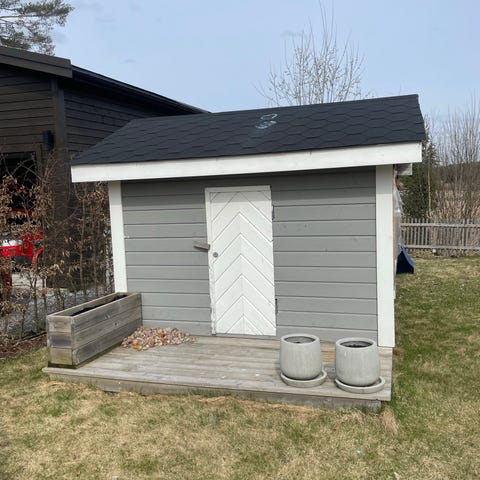 Lekehus, dukkestue eller redskapsbod. Originalt bygget sammen med et annet funkishus i gaten på 30-tallet. Flyttet til vår hage på 80-tallet. Meget solid og velbygget. Ingen fukt/råteskader så vidt vi kan se.
