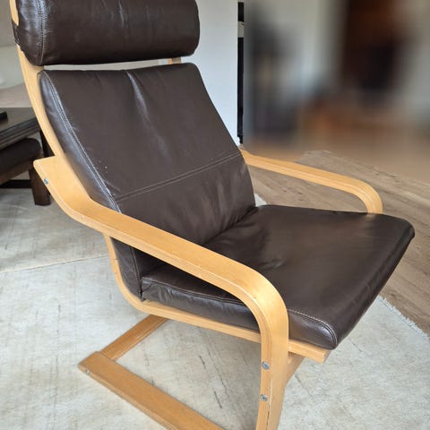 Selger to stk Poäeng stoler med skinn og en puff for 1500 for alt eller 800kr for en stol. Stolene er nesten like fine som nye. God å sitte i. Må hentes. Selges helst samlet.