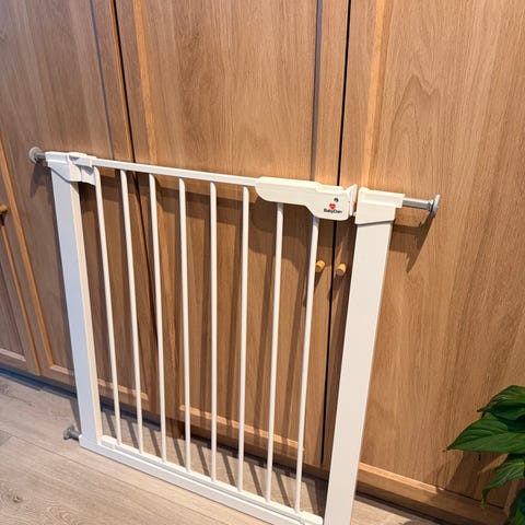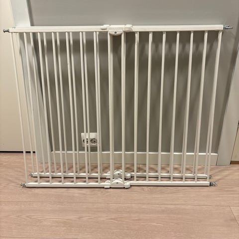 BabyDan sikkerhetsgrind i hvit metallutførelse. Trykkmontert grind som egner seg til bruk i døråpninger eller mellom rom for å hindre at små barn får tilgang til bestemte områder. Grinden har vertikale spiler og åpnes med låsemekanisme øverst. Ekstra forlengerdel følger med på bildene, som kan brukes for å tilpasse grinden til bredere åpninger. Passer til innendørs bruk i hjemmemiljø.