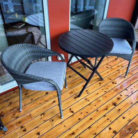 Villa Collection rotting kafesett med to stoler og rundt bord. Settet er i flettet rotting i grå/beige farge og stolene har løse sitteputer i grått stoff. Bordplate i glass med underhylle