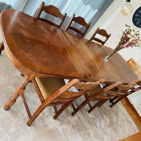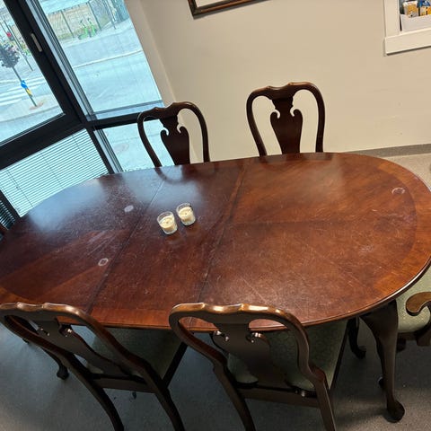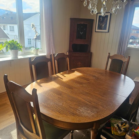 Spisebord til salgs med tre stoler på kjøpet. Slitt, men kan fint pusses opp. Defekt å utvide, plater følger ikke med.