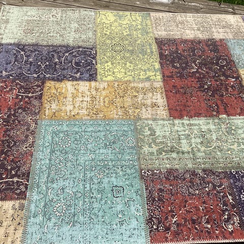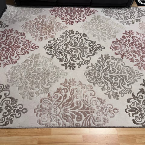Størrelsen er 280 x 360 cm, egnet som stort stue- eller spisebordsteppe i oppholdsrom og andre tørre innemiljøer.