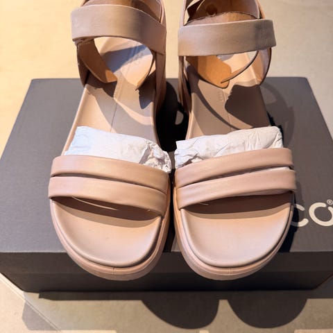 Super komfort + elegant look - sjelden kombinasjon for sommer sko / sandaler ! Nyde (natural, pallerose) farge passert for alt! 38 størrelse Ecco. Nude (pallerose-lalender farge). Nydelig myk lær inne/ ute- pusting og praktisk sko modell som passer fir dame med sensitivt hudfootene. Helt ny, kløpt par år siden , men ligger i skap siden jeg foretrekker nå 39 str. Pris kan diskuteres. Sendes!