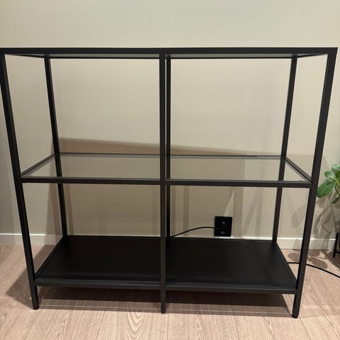 Hel og fin hylle/skjenk fra IKEA. Ingen synlige bruksmerker. Metallramme med treplater i topp og bunn, samt en glassplate i midten.