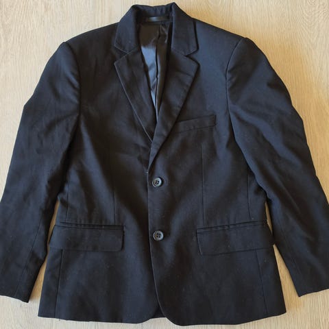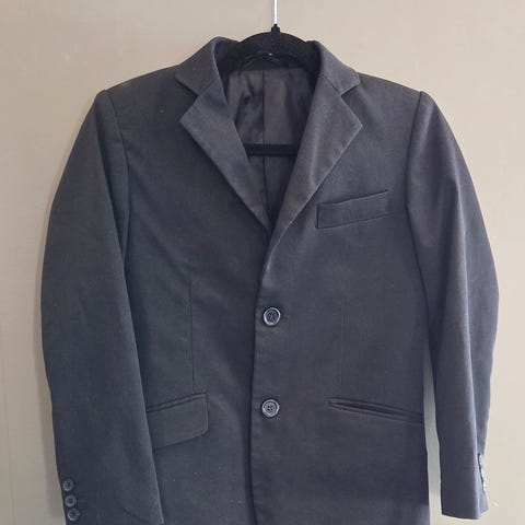 Sort dressjakke str 134. Ser en flekk, har ikke prøvd noe på å få den vekk. Men ser ut til at det skal gå