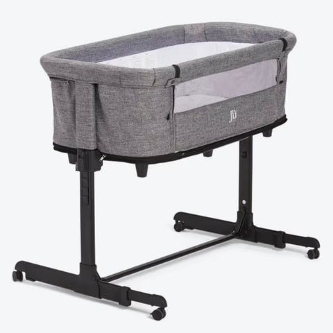 JLY bedside crib barneseng i grå tekstil med svart metallstativ. Sengen er utformet for å stå inntil foreldreseng, og har justerbare ben for tilpasning i høyde. Liggeflaten har madrass og myke tekstilkanter. Egnet til spedbarn som trenger å ligge nær foreldre om natten. Passer som første seng ved siden av voksenseng i soverom.