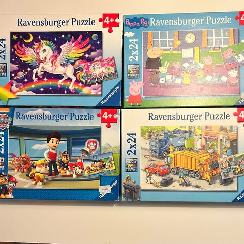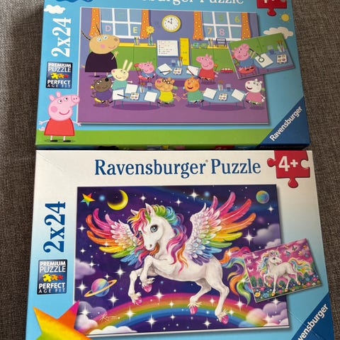 Ravensburger 2x24 brikker puslespill med motiver av Peppa Pig, Paw Patrol og kattunger. Hver eske inneholder to puslespill med 24 brikker. Puslespillene er beregnet for barn fra 4 år og oppover, og leveres i esker med fargerike motivbilder på lokket som viser ferdig puslet motiv. Egner seg til rolig aktivitet, trening av finmotorikk og bildegjenkjenning for yngre barn.