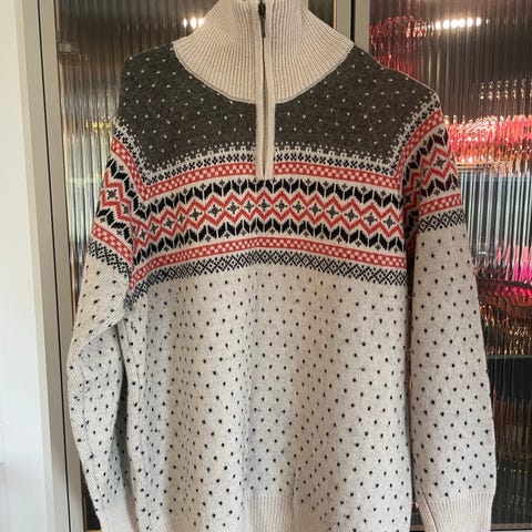 «Ullgenser i myk og behagelig dobbeltstrikket ullmiks. Like fin til hverdags som til mellomlag på tur! Høy krage med glidelås. 60% ull / 40% akryl.»
