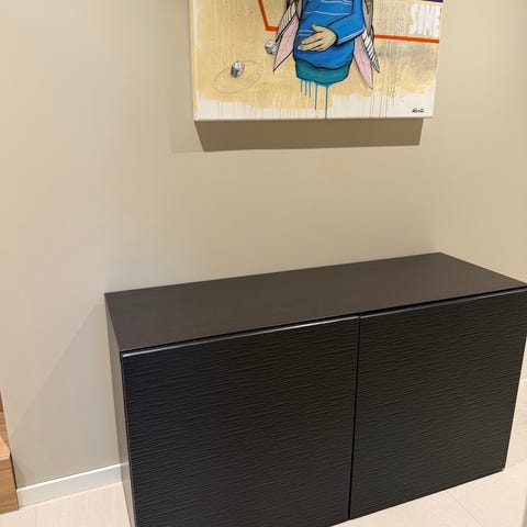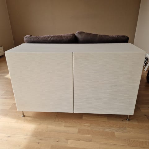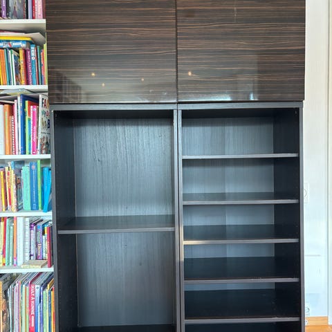 Ikea Bestå skap i rød høyglans med mørk innside. Skapet har hengslede dører og er laget i plate-/trebasert materiale med glatt, lakkert overflate. Egner seg som oppbevaringsmøbel i stue, gang, kontor eller andre rom der det er behov for lukket lagringsplass.