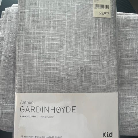 Anthoni gardiner fra Kid i ekstra lang lengde, mørkgrå farge. Kjøpt på tilbud til 299,-. Selges for 200,- pr fag. Har 4 uåpnede pakker.