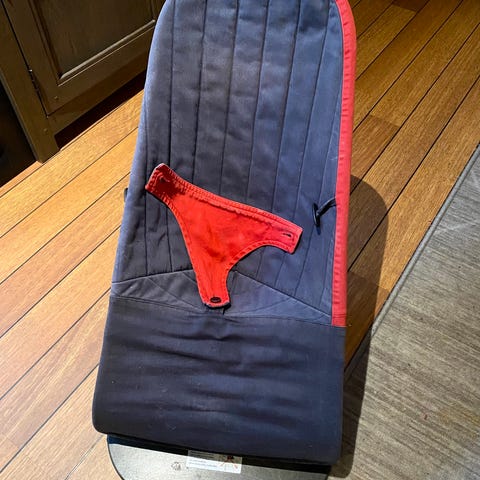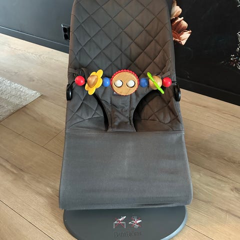 Babybjörn vippestol Bliss i blå farge. Stolen har polstret sete med quiltet mønster og integrert sele for å holde baby på plass. Regulerbar liggeposisjon. Meget pent brukt. Selges under halv pris for 900. Hentes i Kroppanmarka.