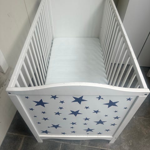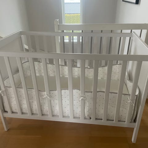 IKEA sprinkelseng i tre med naturfarget finish. Sengen har klassisk sprinkeldesign med tette spiler på alle sider. Egnet for baby og småbarn innenfor standard mål for sprinkelseng. Passer til bruk på barnerom eller som ekstra seng hos besteforeldre eller i andre oppholdsrom. Madrass og sengetøy følger ikke nødvendigvis med, og må eventuelt tilpasses standard størrelse for IKEA sprinkelseng.