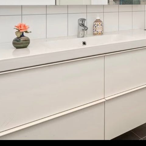 Innredningen er egnet for montering på bad og gir kombinert vaskeløsning og oppbevaringsplass. Nøytral hvit farge gjør at den kan passe inn i ulike baderomsstiler.