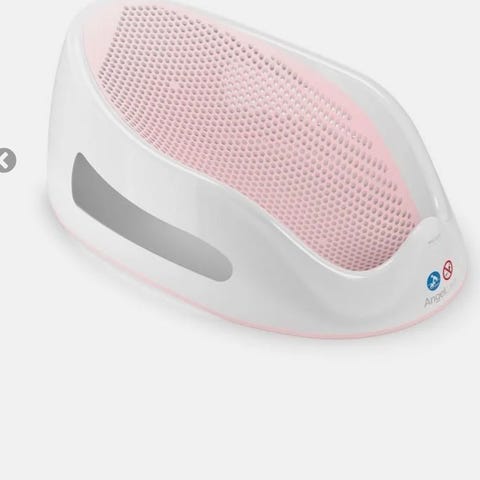Pent brukt Angelcare badestol i plast for baby. Modellen er utformet som en ergonomisk liggestøtte som plasseres i badekar eller balje. Innsiden har en rosa, perforert overflate som slipper gjennom vann og gjør at støtten tørker raskt. Yttersiden er i hvit, lett og slitesterk plast. Materialet er mykt å ta på og er laget for å være motstandsdyktig mot mugg. Badestøtten har små føtter for stabilitet mot underlaget og et hull øverst for enkel oppheng og tørk. Egnet til bading av spedbarn og små barn som trenger støtte til hode og kropp under bading.