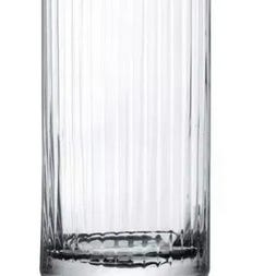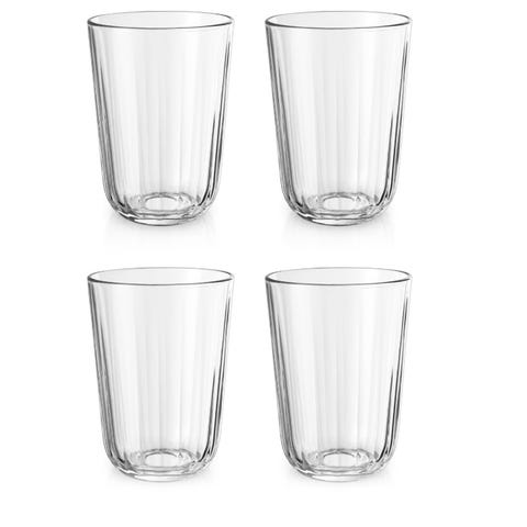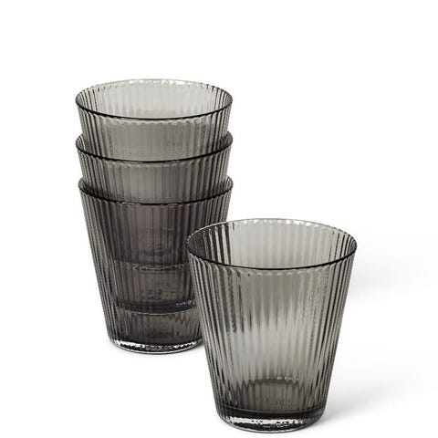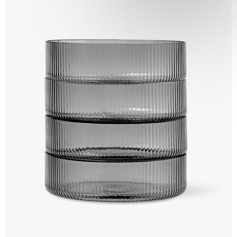 Ferm Living drikkeglass sett med fire glass i smoked grey glass med vertikalt rillemønster. Glassene har sylinderform med markert fot og jevn overflate innvendig.