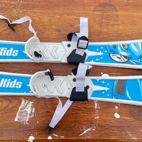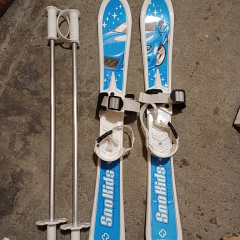 Snokids barneski i blått med hvite detaljer. Skiene har enkle reimer og plastbindinger som festes direkte på sko eller støvler.