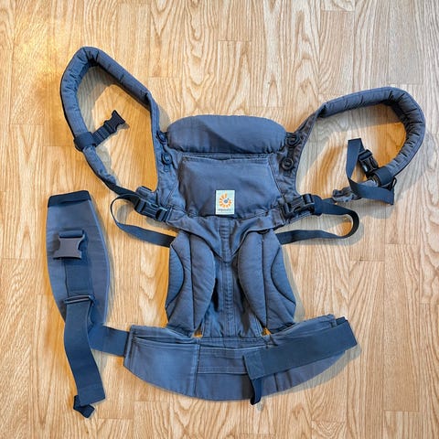 Ergobaby Omni 360 bæresel i blå farge med pustende mesh-paneler. Bæreselen har polstrede skulderstropper og bred, justerbar hoftereim med spenne for god støtte. Flere justeringsmuligheter gjør at selen kan tilpasses både bærer og barn. Fronten har en liten glidelåslomme. Egnet til å bære barn i ulike posisjoner (mage og rygg) etter behov, innenfor anbefalt vekt- og aldersgrense fra produsent.