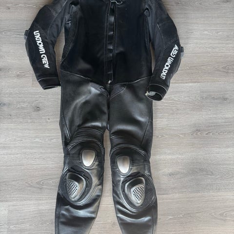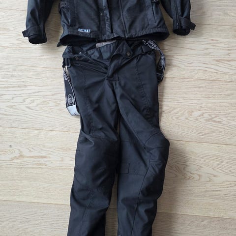 Sweep mc-dress for barn i todelt modell med jakke og bukse. Sett i svart tekstil med gule kontrastdetaljer og refleksfelt. Jakken har glidelåslommer foran og justeringsmuligheter i livet og på ermene. Buksen har seler, justerbar midje og glidelås nederst på bena. Egnet som kjøreutstyr til motorsykkel eller moped for barn, med praktiske løsninger for komfort og synlighet. Størrelse jakke 130 og bukse 140. Nesten ikke brukt.