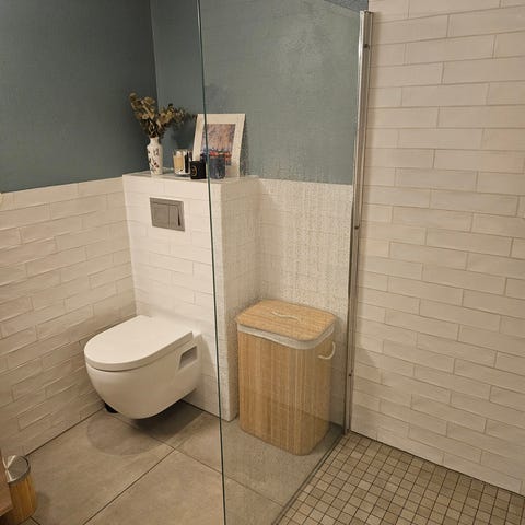 Dusjvegg i klart glass og krom. Veggen er rett og festes med metallstag i overkant mot vegg. Mål 190x85 cm.