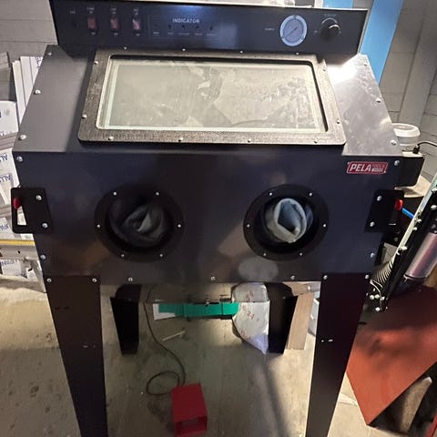 Kabinettet har integrerte hansker i front og stor inspeksjonsrute på toppen for oversikt under arbeid. Det er tilkoblet luftslange i front for bruk sammen med kompressor. Egnet for rengjøring, rustfjerning og overflatebehandling av mindre deler i et lukket arbeidskammer. Passer for verksted, hobbyrom eller garasje der det er behov for kontrollert sandblåsing.