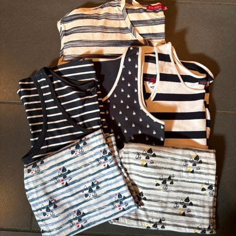 2 maritime sommer gensere i blå og hvite striper. Den til 100kr er litt tykkere i stoffet enn den andre stripete. Og 1 marine blå med oppbrett på ermer. Den er myk og behagelig i stoffet. 50kr. Lite brukt og selges billig. Pluss frakt. Kan sende 🎁