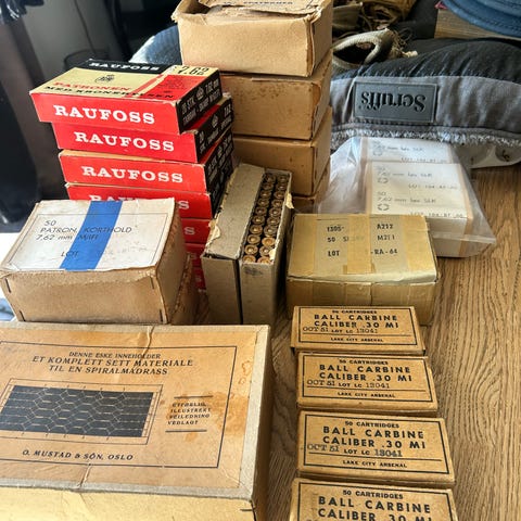 Selger en full kartong med Raufoss ammunisjon i kaliber 7,92/8x57. Det er totalt 20 esker med 15 skudd på skinner. De fleste av pakkene er uåpnet, og det er en blanding av årgang 1948 og 1949, samt ett par esker fra 1950. Ammunisjonen har vært lagret tørt.