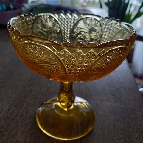 Dette er en vintage ravfarget og rød pressglass-stettskål produsert av Ząbkowice Glassworks i Polen, 1960- 1970-tallet. Glasset har en unik fargeeffekt, ofte kalt "Amberina", hvor fargen skifter fra gult i bunnen til rødt øverst, noe som oppnås ved å gjenoppvarme deler av glasset.
