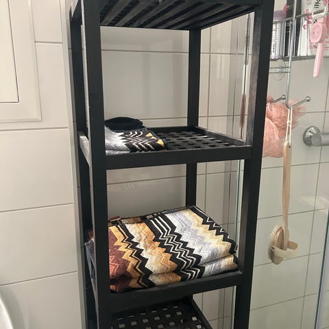 Hylle reol i tre med fem åpne, lamellformede hyller i brun utførelse. Reolen er smal og høy, og egner seg godt til oppbevaring på bad, vaskerom eller andre rom der det er behov for ekstra lagringsplass. Åpne hyller gir god lufting rundt innholdet, og trekonstruksjonen gir et naturlig uttrykk. Kan plasseres frittstående inntil vegg eller i et hjørne for å utnytte plassen effektivt.
