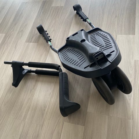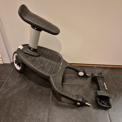Emmaljunga ståbrett med sete til barnevogn i svart. Brettet festes bak på vognen med kroker på hver side av understellet. Det har to hjul bak og en ståflate med struktur for bedre fotfeste. Setet er polstret og montert på en bøyle over ståflaten, slik at barnet kan velge å sitte eller stå. Egnet for bruk sammen med kompatible Emmaljunga-barnevogner for et ekstra barn som kan stå eller sitte bak vognen under trilleturer.