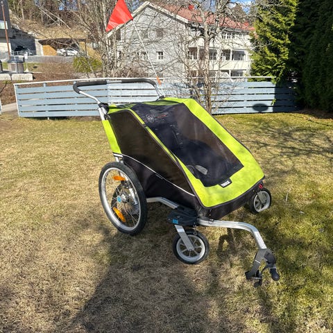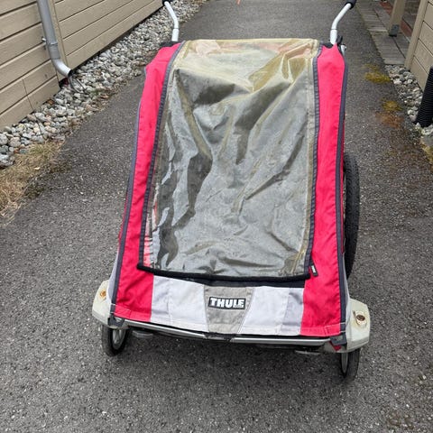 Selger en solid og allsidig Thule Chariot Cougar 2 for to barn. Dette er en kvalitetsvogn som kan brukes hele året. Komplett med ekstrautstyr som gjør at den kan brukes som vanlig vogn/løpevogn, sykkelvogn og pulk. God sitteplass til to barn med sikkerhetsseler, og dersom barna har ulik vekt kan man justere fjæringen individuelt på hver side. Sammenleggbar for enkel transport.
