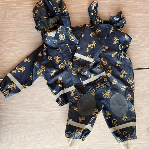 Godt brukt regnsett, brukt til 2 barn i barnehage. Ingen hull eller rifter, men er slitt av vanlig bruk. Vasket etter anvisning. Må kjøpes til strikk til føttene. Fortsatt mye bruk igjen!