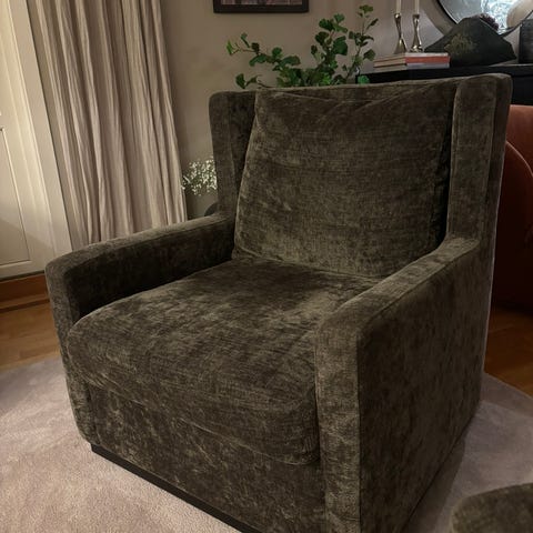 Blå stol selges med grønt pledd og pute fra Gant. Selges samlet 800 kr. Har kun stått til pynt. Høyde 93 cm bredde ca 53 cm. Sender ikke