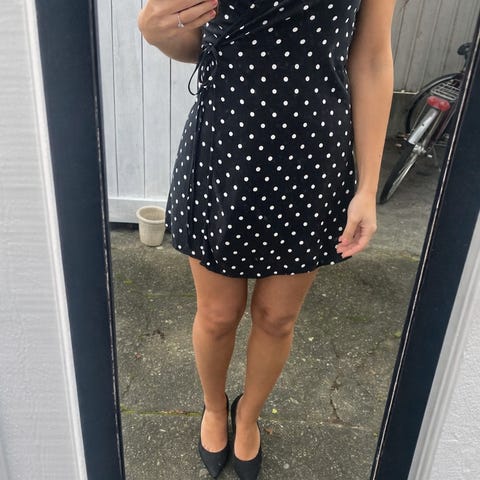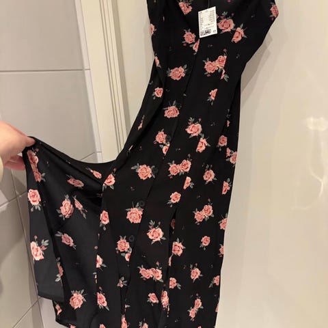 H&M sommerkjole for dame i størrelse S. Kjolen er svart med blomstermønster og laget i viskose. Modellen har kort erm, V-utringning og omslag med knyting i livet. Lengden går omtrent til over kneet, avhengig av høyde. Passer til bruk på varme dager og kan kombineres med både sandaler og jakke eller cardigan.