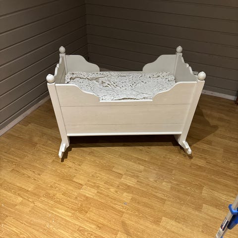 Vugge produsert i solide materialer. Hvtmalt. En madrass medfølger.