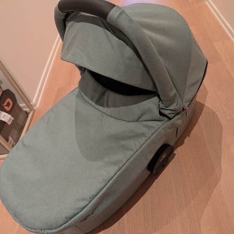 Bagdelen har justerbar kalesje med lufting og bærehåndtak, samt myke tekstilflater innvendig.