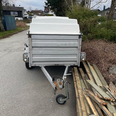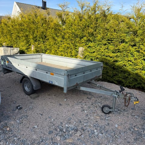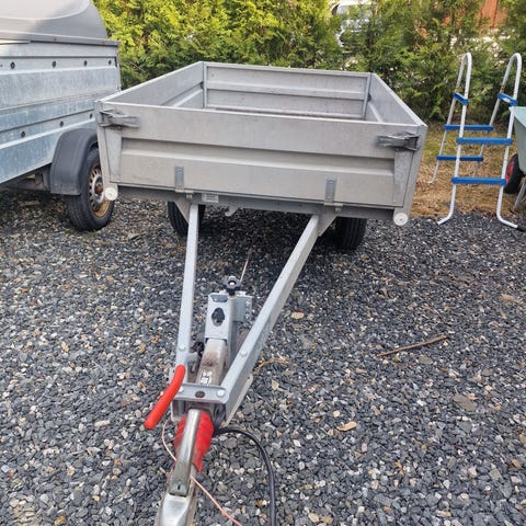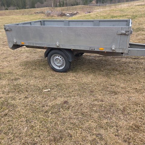 Fin tilhenger , med Aluplate i 6mm . Kunne trengt nye dekk ellers bra tilhenger. Veldig fint med glatt Aluplate for lossing av grus , mindre skade på møbler osv . Den er registrert