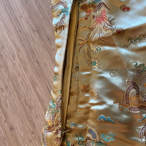 Bareeze kjole til spesiell anledning i beige silke i one size for dame. Kjolen har et helhetlig blomsterbrodert mønster og er laget i et glatt, lett skinnende silkestoff. Passformen er rett med korte ermer og rund hals. Egner seg til bruk ved høytidelige anledninger eller andre formelle sammenhenger der man ønsker et tradisjonelt og enkelt uttrykk.