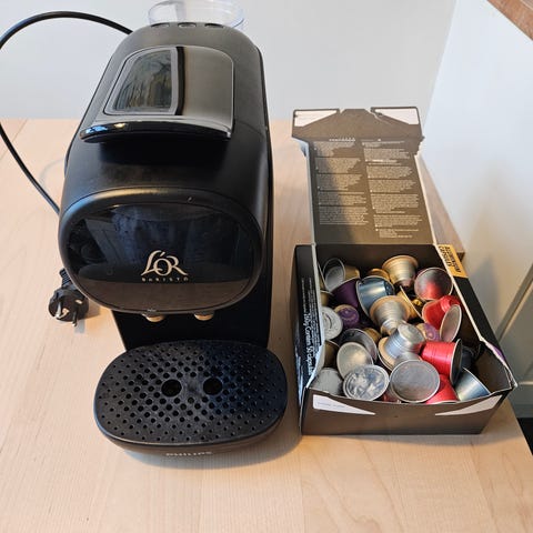 Nesten ny L'or kaffemaskin. Produsent: Philips. Fikk den til gave, men jeg har allerede kaffemaskin hjemme. Testet på en pakke med kapsler