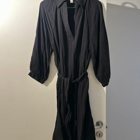 Knytekjole/omslagskjole i kimonostil, str XXL. Vil nok kunne brukes av XL også. Aldri brukt, men hengt i et skap i noen år. Bør vaskes før bruk.