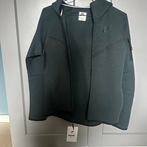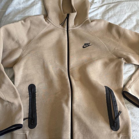 Nike Tech Fleece hettegenser i str XS. Jakken har glidelås i full lengde, fast hette, to frontlommer og en lomme på venstre arm med glidelås. Fargen er beige med mørke kontrastdetaljer og Nike-logo på brystet. Passer til hverdagsbruk og lett trening.