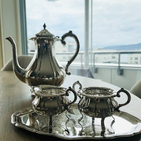 Kaffeservise i tre svenske kroner sølv,i dragestil.Kanne,fløtemugge ogsukkerfat.