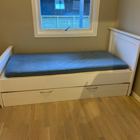 Selger to enkeltsenger på 90cm til 200kr. Kan settes sammen til en dobbeltseng. Den ene sengen har bruksmerker på to av hjørnene etter å ha stått mot veggen. Sengene har stått i utleieleilighet. Kan følge med to brukte overmadrasser om ønskelig.