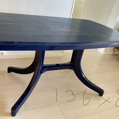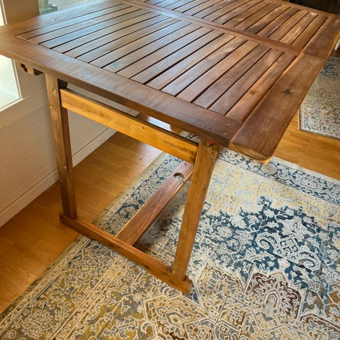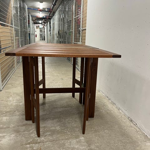 Utebord i tre i brun farge. Bordplaten består av lameller med mellomrom mellom, og bordet står på rette ben med tverrstag for stabilitet. Egnet som spisebord på uteplass. Når klaffen bøyes ned tar bordet veldig lite plass.