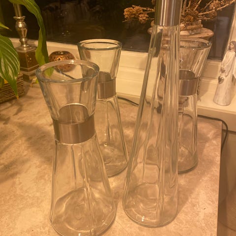 Eva Solo te brygger, oljesett og sukker/fløte sett i klart glass med detaljer i rustfritt stål og silikon. Settet består av flere karaffler i ulike størrelser, noen med helletut og propp, samt en te brygger med stålfilter og medfølgende tekstiltrekk med glidelås.